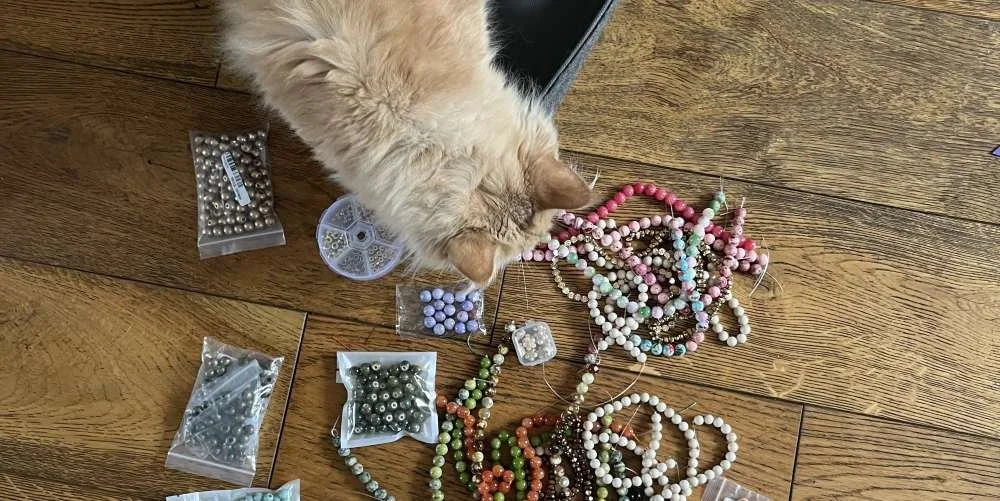 That’s Ella, my Maine Coon, and she very much sees herself as part of the process. She often sits close by when I’m making jewellery, usually surrounded by beads as if she’s supervising everything… really she’s just playing with them!